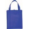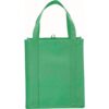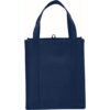 Perfect alternative to plastic bags. Open main compartment. Supportive bottom board. Reinforced binding on edges. Interior fabric loop at opening for attaching bag to supermarket checkout frames. Reinforced handles and binding for added durability. 10 inch handle drop height.