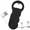 The Bottle Opener with 3-in-1 Charging Cable includes a USB A cable, cable with a 2-in-1 integrated tip for charging both Android and iOS devices and a Type C tip for newer generations of Android devices.
