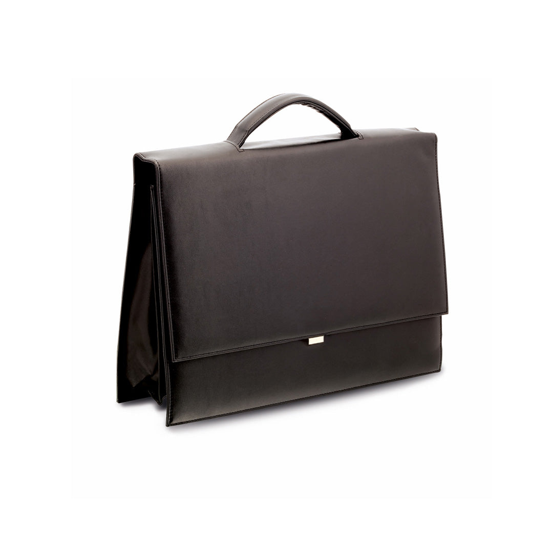 High quality briefcase in soft and resistant PU leather with an elegant black colour finish. With 2 independent inside compartments and comfortable reinforced carrying handle set. Inside compartments with pen sleeves and presented inside an elegant fabric bag.