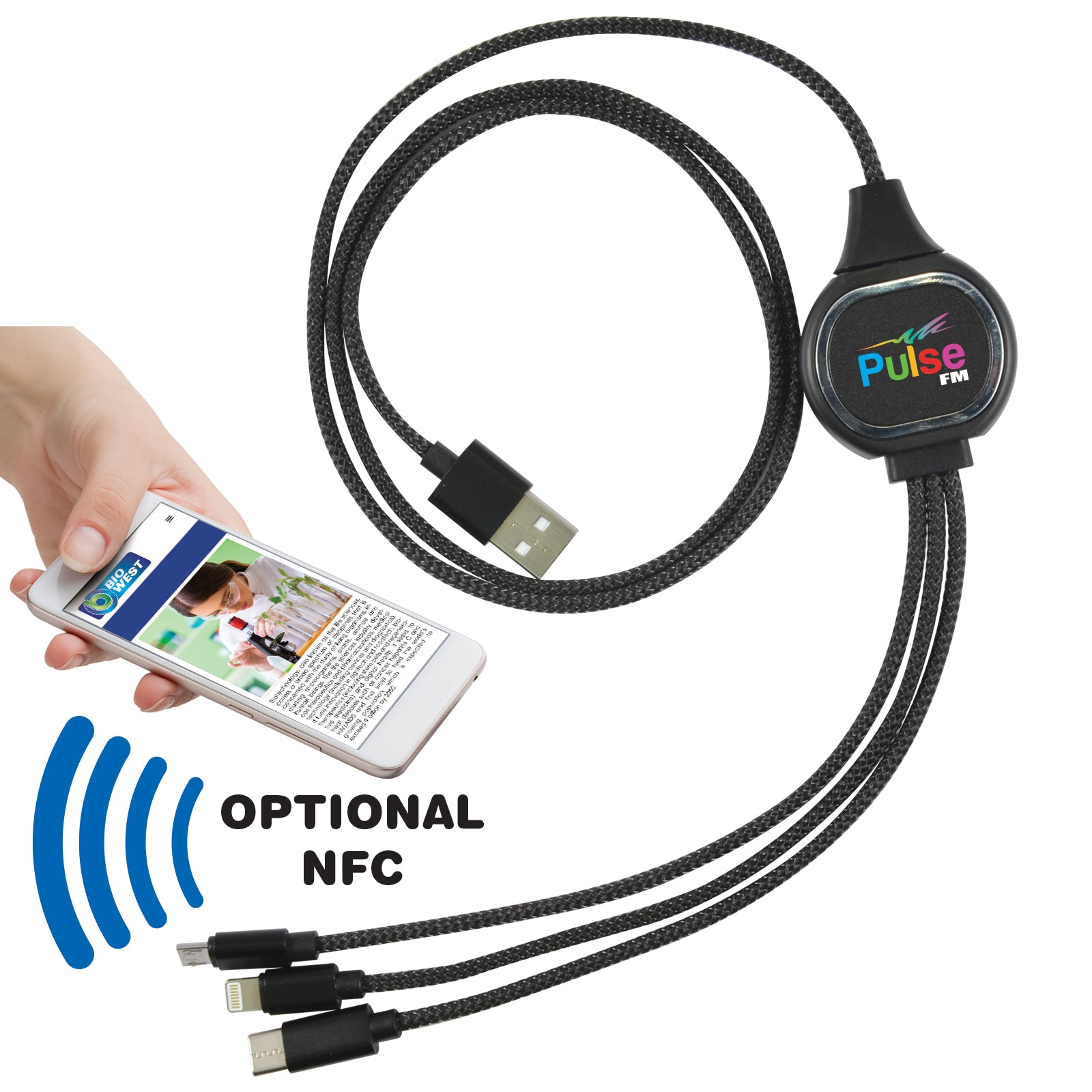 3 in 1, 1 metre braided cable with illuminated panel with light up logo.