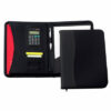 Black smooth PVC cover with grey trim. Features lined A4 notepad, pen loop, multiple business card holders and inside zippered pocket. Optional dual powered D980 calculator. Supplied in Polybag.
