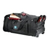 Large main compartment with U-shaped zippered opening. Zippered front accessory pocket. Two top-loading end compartments. Shoe Compartment. Inline skate wheels with corner protectors. Extendable, locking telescoping handle.