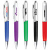 A click action ballpoint pen with silver barrel, black ink, a soft grip and a metal pocket clip.