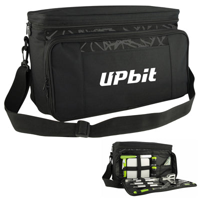 Large|zippered insulated cooler with BBQ tools and adjustable shoulder strap. Supplied in polybag.