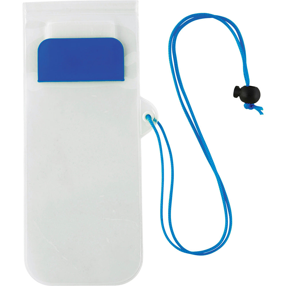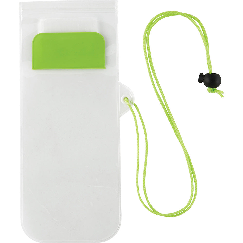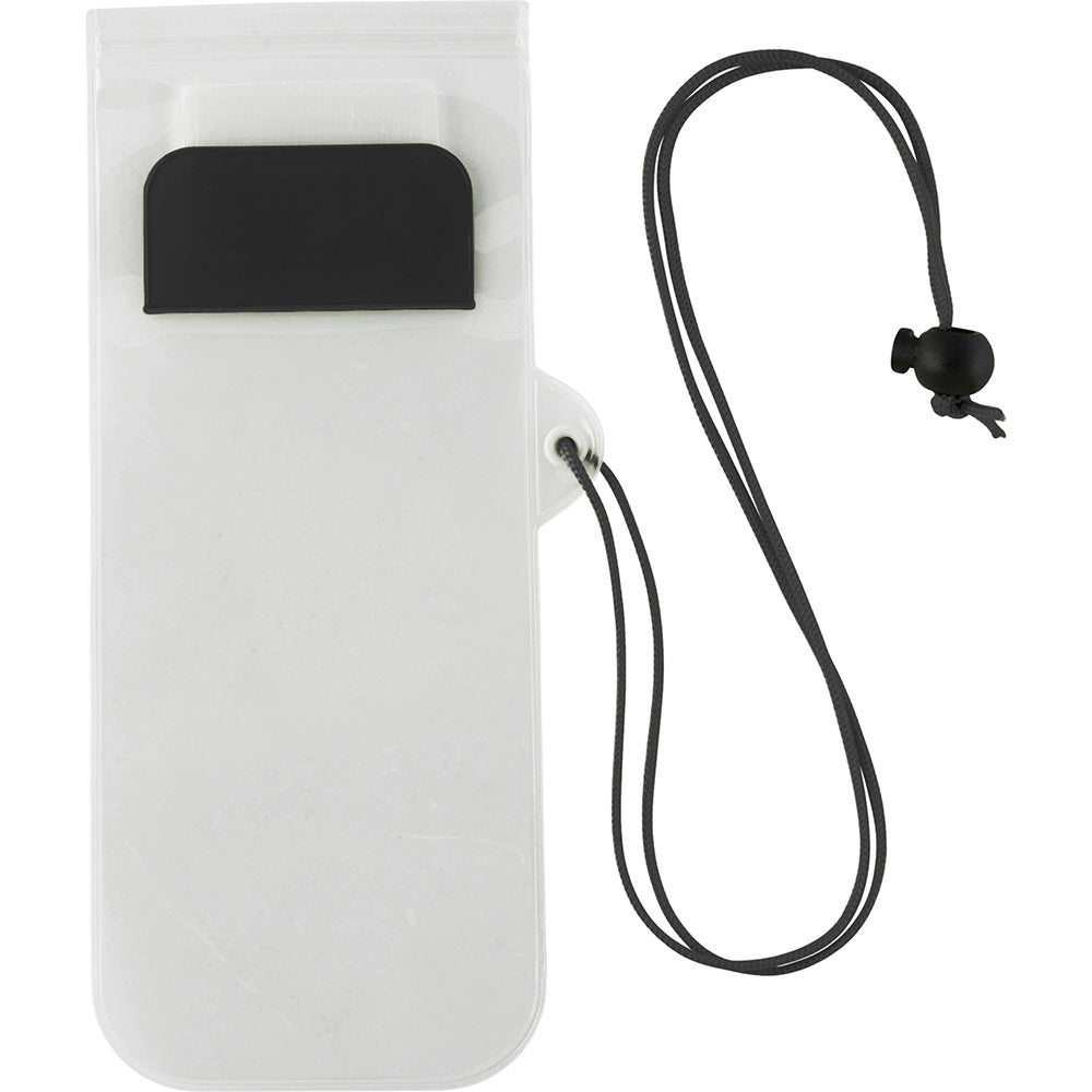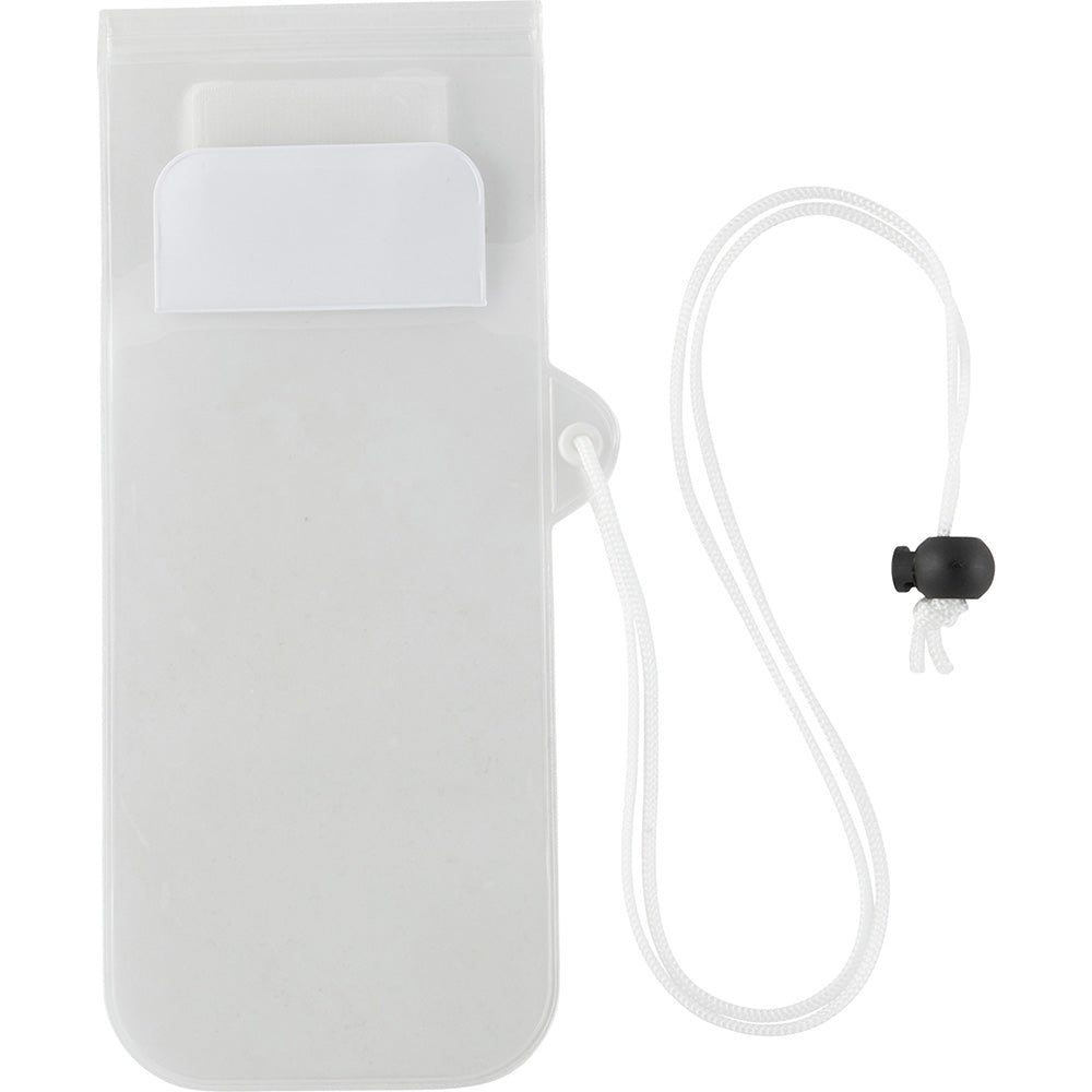 Storage pouch with frosted white back, transparent clear touch screen front window with zip lock and pop-up colour flap with hook and loop closure. Includes neck cord with drawstring closure.