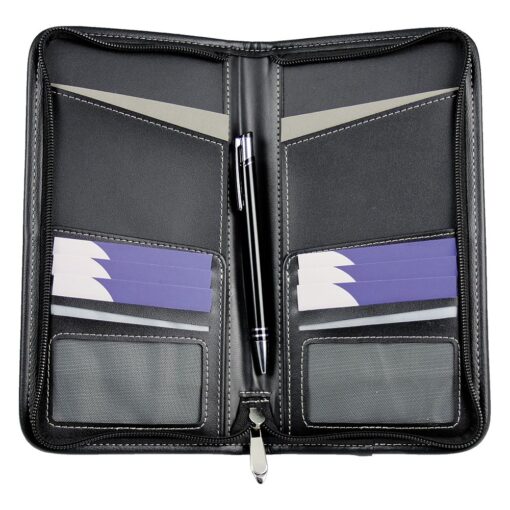 This zippered travel wallet is manufactured with microfibre outer and trimmed with imitation leather. Features: Features contrast stitching, 8 business/credit card slots, 2 deep pockets and 2 document sections. Product Size: 245mm(h) x 130mm(w). Available Colours: Black. Material: Microfiber. MOQ: 25 | Quantity less than MOQ needs to be quoted, Please contact our staff.