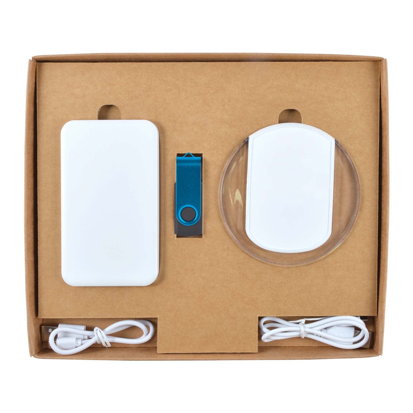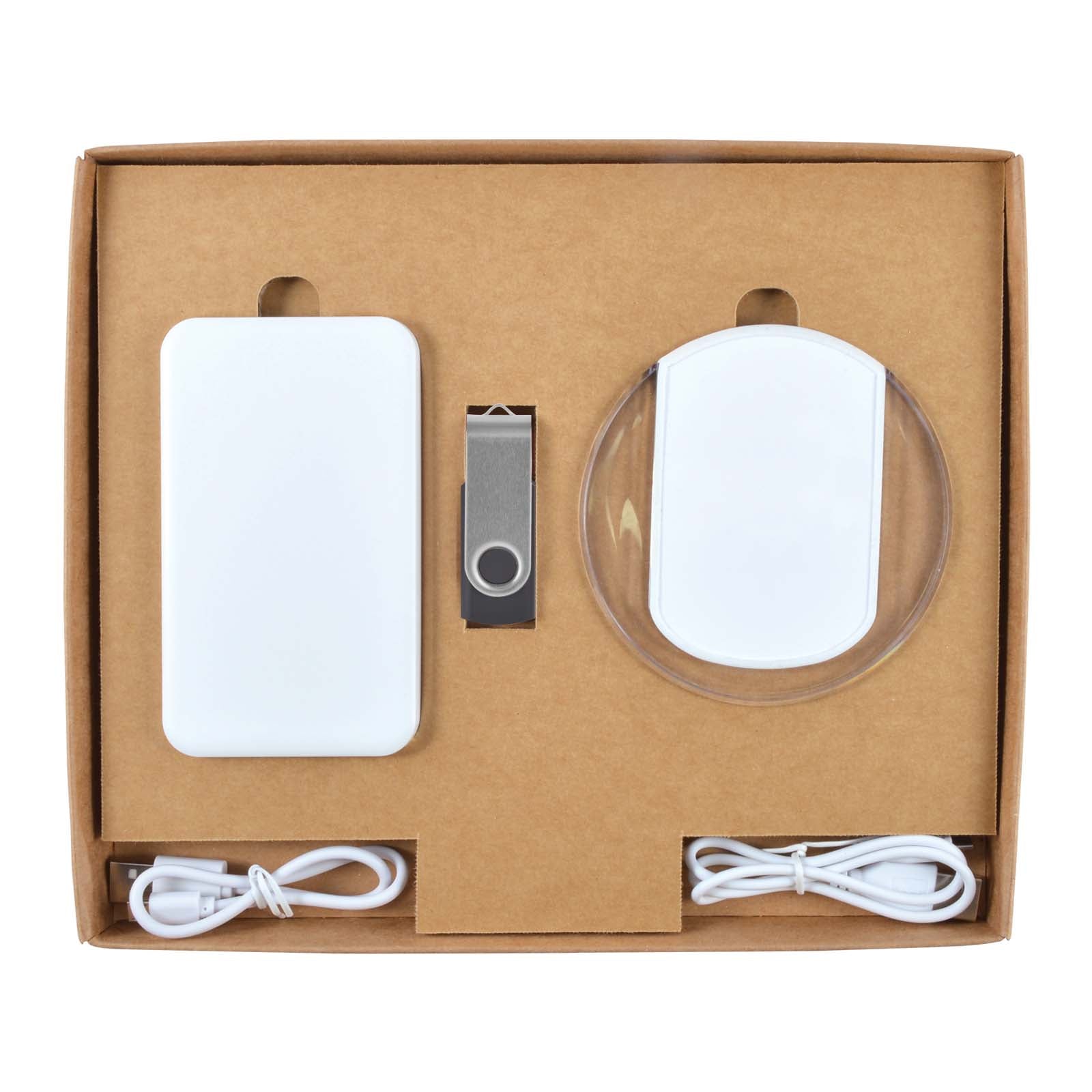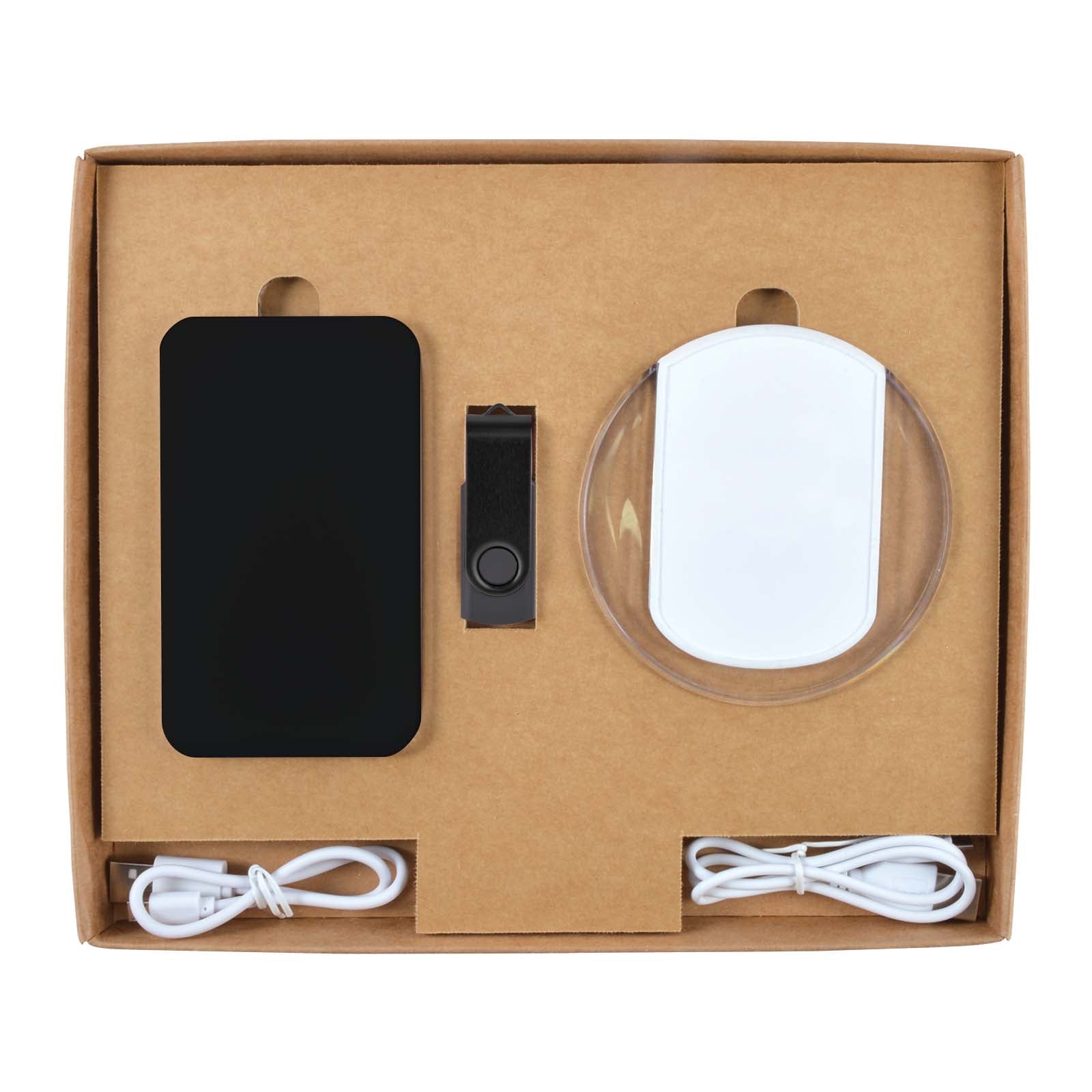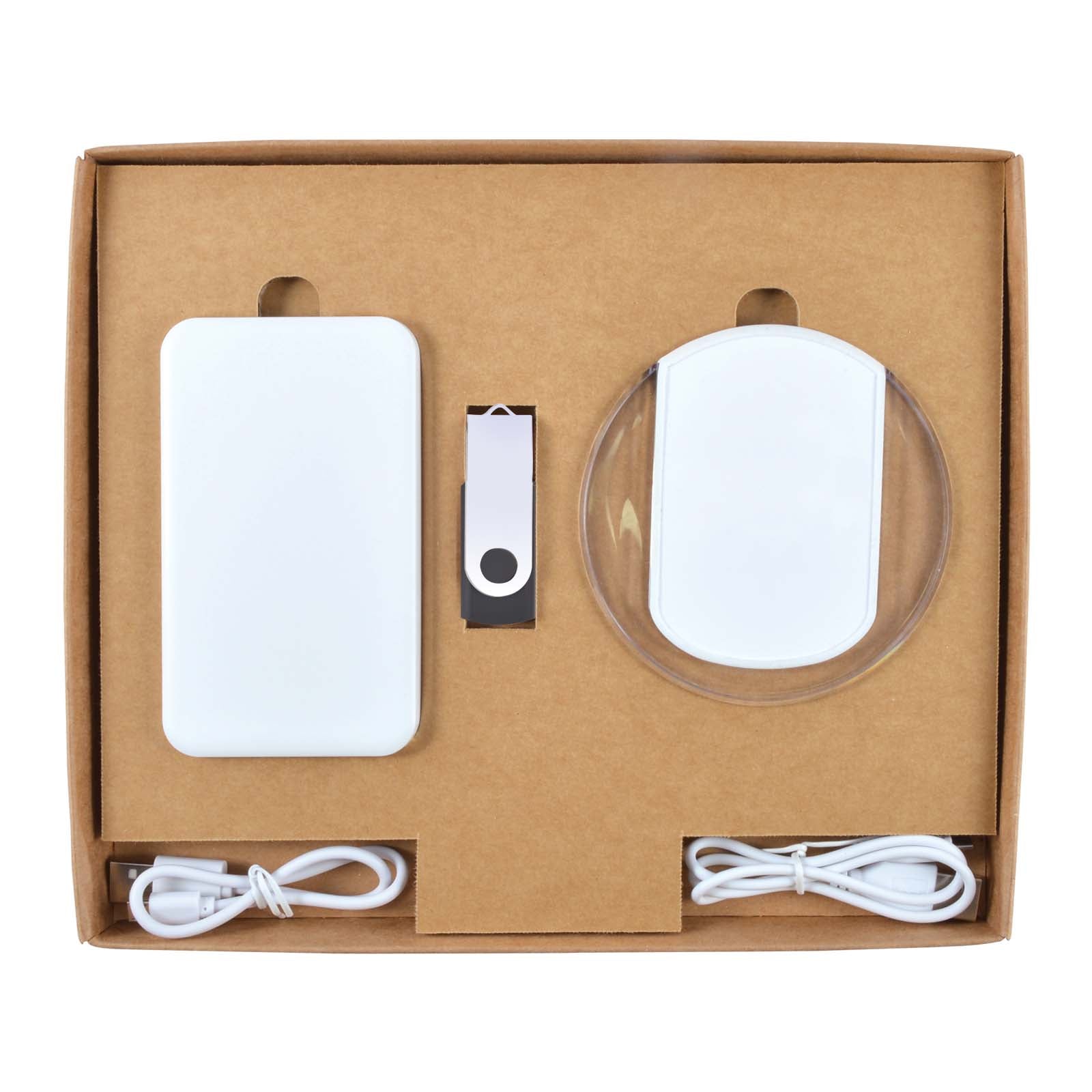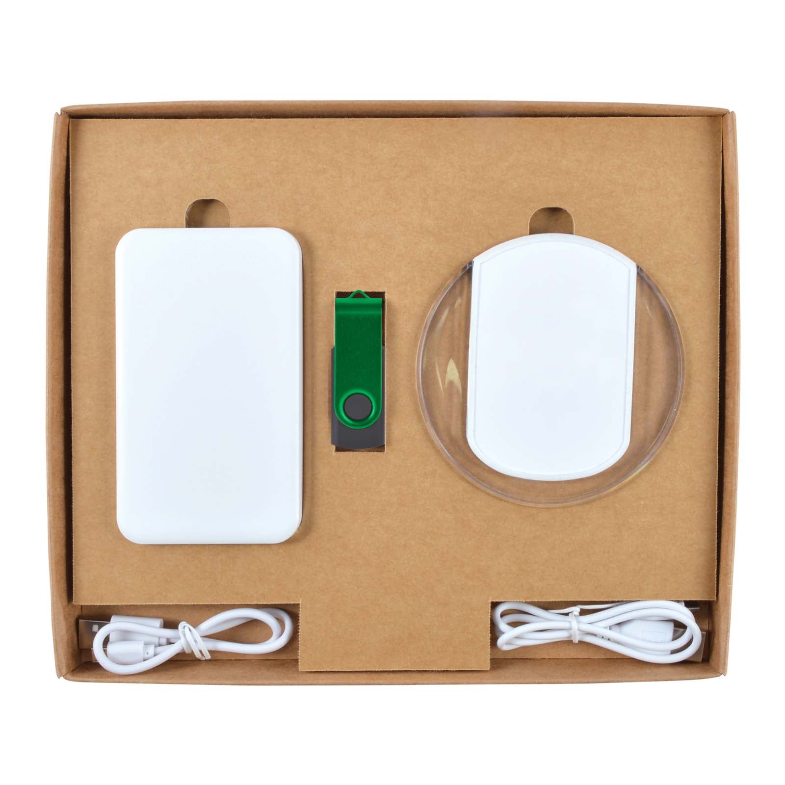 Includes items:LL0211 Karma Inductive Wireless Charger LL9205 Dynamo Inductive Charger Power Bank LL9600 Swivel Flash Drive LL844 Gift Box Ambassador Natural.