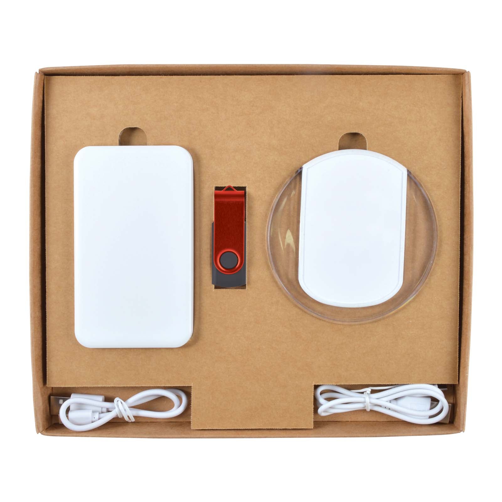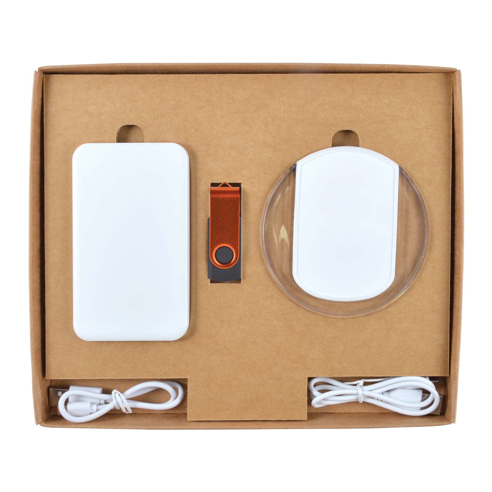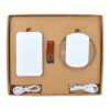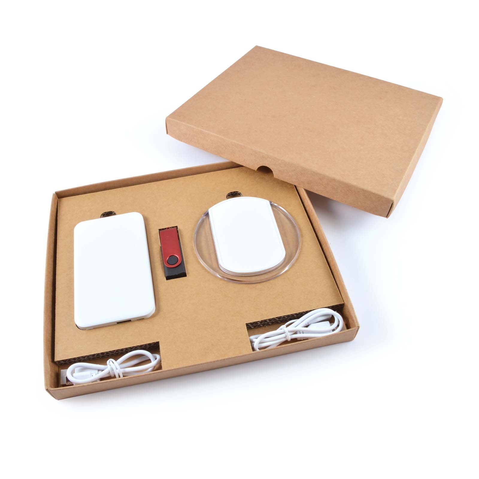 Material: Box – Cardboard, Flash Drive – ABS body, aluminium shell, Power Bank, Wireless Charger – ABS case.