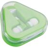 Use with any standard audio device. Triangle-shaped plastic case with cable storage. 3.5mm audio jack and 46-inch earbud cable. Media device not included.
