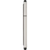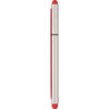 Lid top plastic pen with stylus tip on one end and elastic trimm.