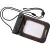 Waterproof travel pouch. Double zipper top closure and double-fold, double-snap closure. Break-away, adjustable lanyard. Keeps valuables safe and visible during outdoor activities.