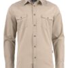 - Western yoke, soft collar, adjustable cuffs and curved bottom hem.