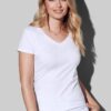Fitted V-neck T-shirt for women, with fashionable length made of a soft and sleek cotton-elastane-blend with contrast neck tape.