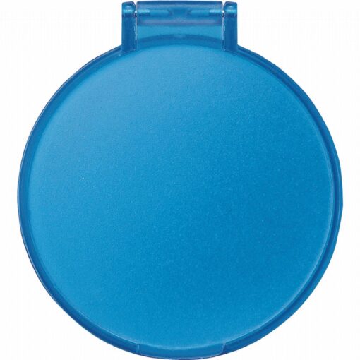 Flip-top cover converts to mirror stand. Product Size: 60mm (H) x 60mm (W) x 4.5mm (D). Available Colours: Translucent Blue. Material: Plastic. MOQ: 50 | Quantity less than MOQ needs to be quoted, Please contact our staff.