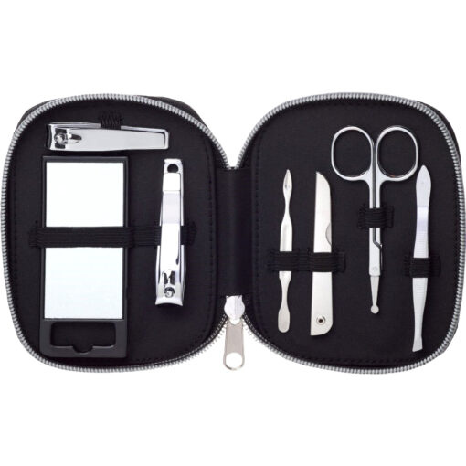 Zippered case with open top pocket on front cover. Includes personal mirror, fingernail clipper, toenail clipper, cuticle tool, nail file, scissors and tweezers. –Undecorated Stock Available in 5 Working Days–. Product Size: 132mm (H) x 113mm (W) x 29mm (D). Available Colours: Black,Graphite,Light Blue. Material: Woven nylon case with stainless steel tools. MOQ: 50 | [...]