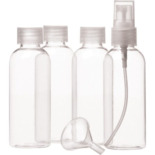 Zip-top resealable pouch for TSA-friendly travel. Includes three 80mL refillable bottles, one 80mL refillable spray bottle and mini funnel. Bottles not available for imprint. Features: Contents packed seperately and not inserted in pouch. Product Size: 181mm (H) x 186mm (W) x 38mm (D). Available Colours: Clear. Material: PVC pouch. MOQ: 50 | Quantity less than [...]